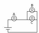 b. If a voltmeter connected across bulb B reads 0.5 volts, what is the voltage across bulb C (assume a 1.5V battery)?