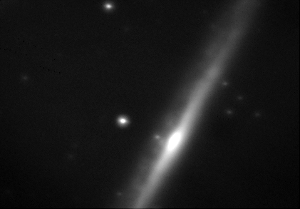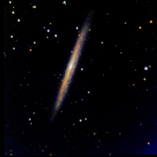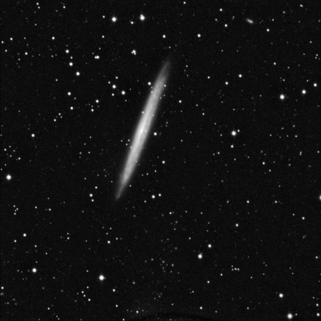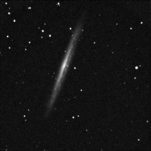 NGC 5907 is a very large and bright, edge-on galaxy in Draco. It is easily visible in an 8" telescope as a long, thin needle.