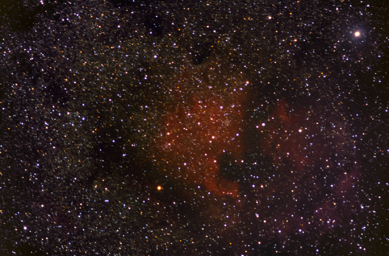 The constellation Cygnus is home to many large and bright emission nebulae. Perhaps the most famous is NGC 7000, the North America nebula. Even from Australia this is not a difficult object for a wide field telescope in dark skies, despite the nebula never rising more than a few degrees above the northern horizon. To the west of NGC 7000 is the fainter emission nebula, IC 5067/70, also known as the "Pelican" nebula.