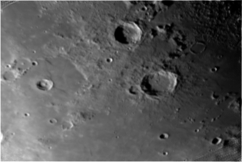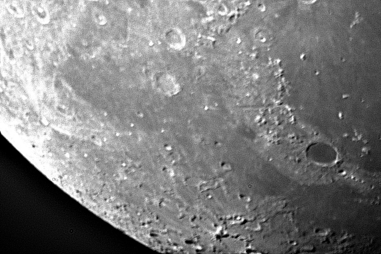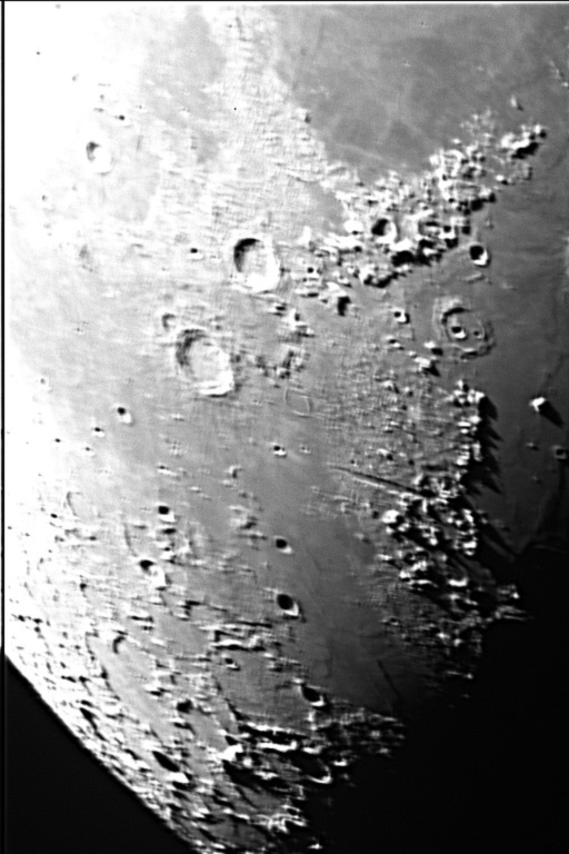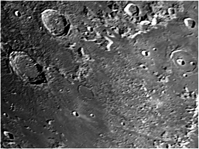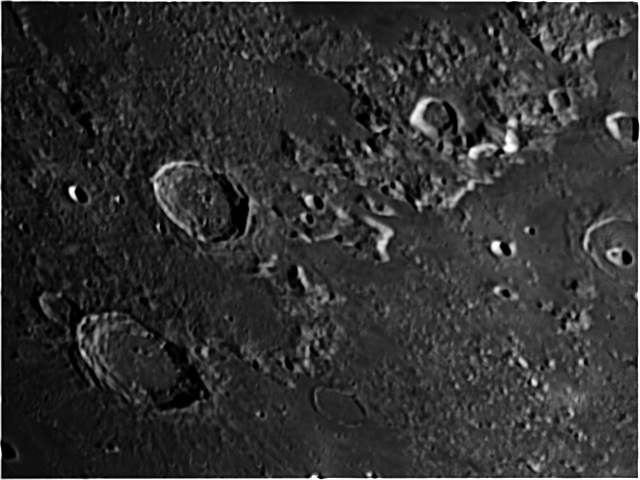 Shortly before first quarter, a pair of large and prominent craters are visible. These are Eudoxus to the south (top) and Aristoteles, which is on the edge of Mare Frigoris.