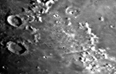 To the west of Eudoxus is the Alpine Valley cutting through the lunar Alps, and further to the west is the large, dark-floored crater Plato.