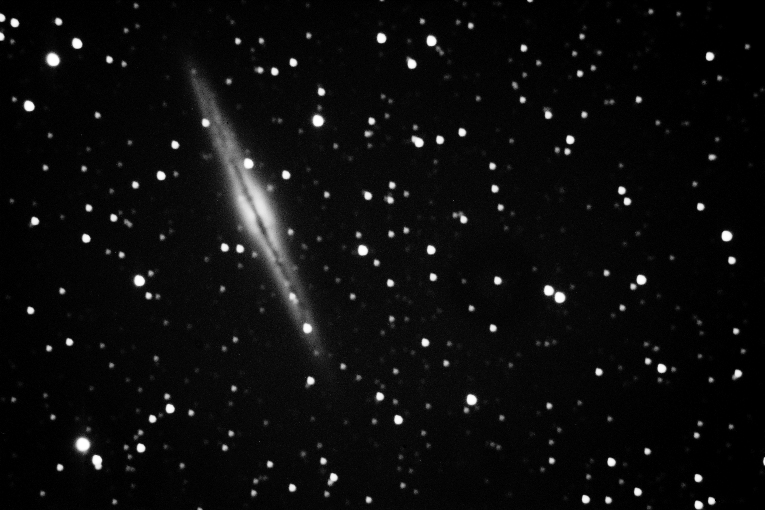 In the telescope, the galaxy appears as a very thin line of light, a little brighter and wider in the centre. The very prominent dust lane running down the middle of the galaxy was not visible in a 10" telescope under moderately dark skies.