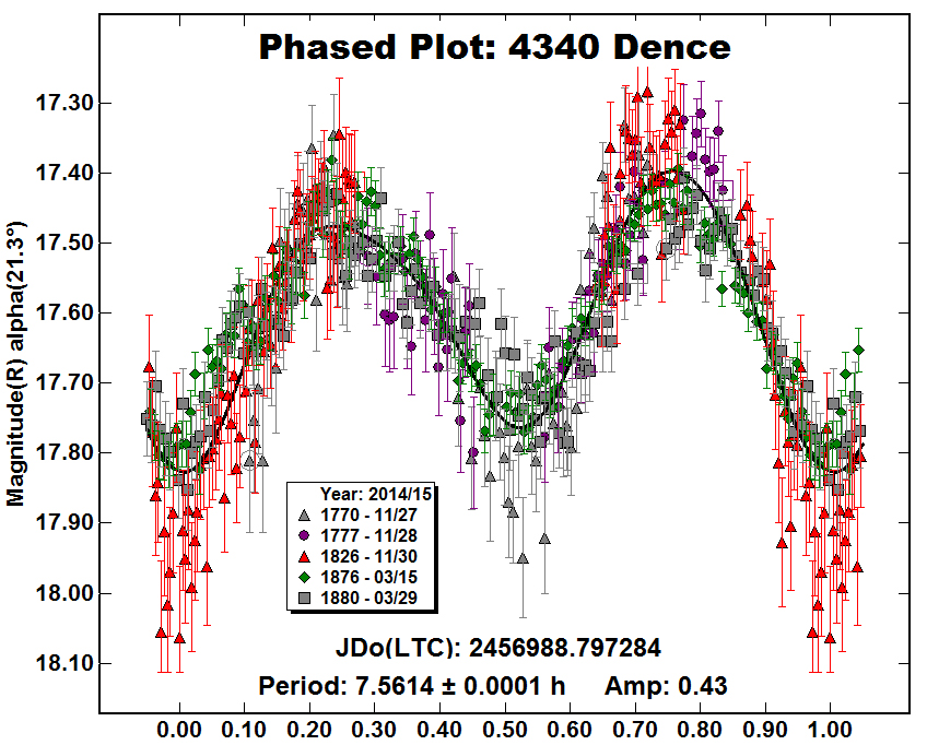 In late 2014 and early 2015 I was able to observe the asteroid again. The five nights of data completely ruled out the earlier results and showed a very clear period of 7.5614 hours. This was almost exactly half of the 15.473 hours that had been suggested in the earlier result.