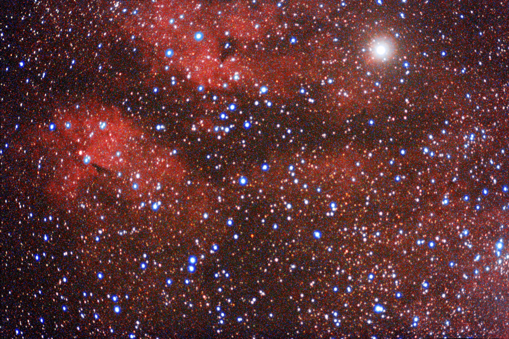 The region around gamma cygni is a wonderful complex of light and dark nebulosity. It is the nearest that the northern sky has to compare to NGC 3372 in the southern sky, although it is much fainter. In adition to the nebula, there are a number of open clusters in the region. The brightest is situated just above gamma. This is NGC 6910.