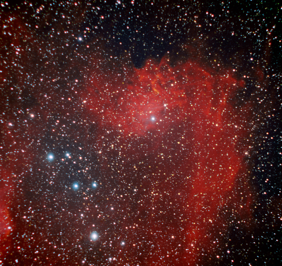 A small portion of IC 410 is visible at the left edge of the image above which was processed using the H-alpha images as the red channel and the SII as the green channel.