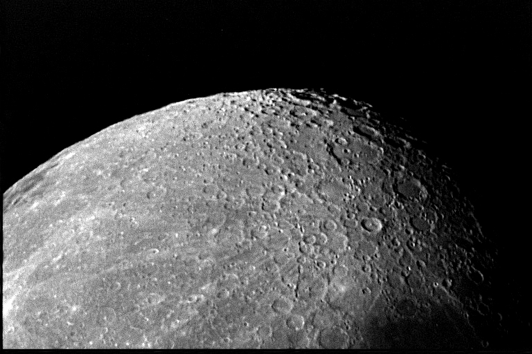 The south polar regions of the Moon contain some of the most rugged and mountaineous terrain anywhere on the lunar surface. Particularly impressive are the Libnitz mountains, which reach over 10,000m high. Higher than any mountain on Earth. In the image above, the lunar south pole is at the right-hand edge of the image.