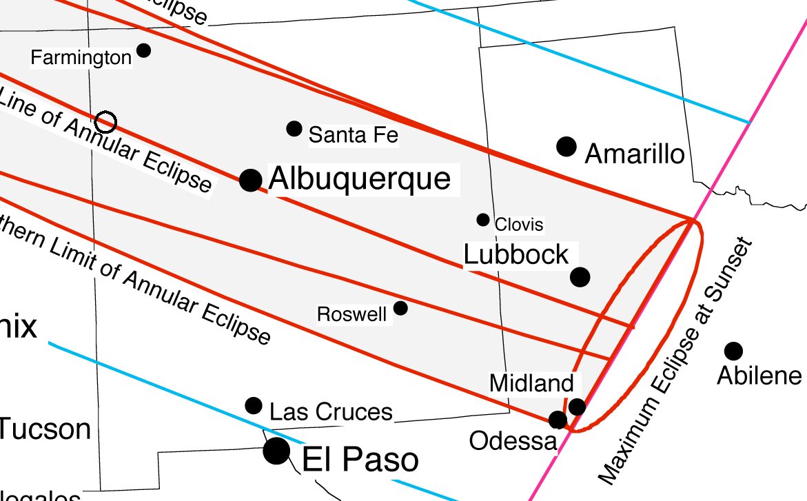 The annular solar eclipse of 20 May, 2012 started in China, passed over the northern Pacific, and ended at sunset over the western United States. Then town where I was located, Lubbock, Texas, was right at the end of the annularity path. Although numerous people and groups were coming to Lubbock for the eclipse, I decided that with the likelihood of clouds on the western horizon at that time of the year, I would rather be further westwards so that the Sun would be a little higher and that any clouds would be in the opposite direction. In addition, I also had to head to California to attend a conference 2 days later.
