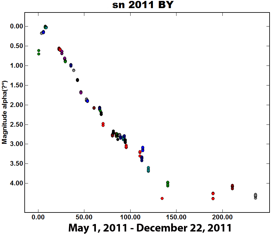 Observations of the supernova continued until December 2011. The resulting lightcurve is shown below. This lightcurve is typical of a Type Ia supernova.