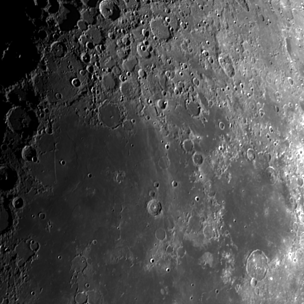 This image shows the Moon from the Straight Wall southwards to Tycho. The crater to the left (east) of the Wall with the smaller crater on its western rim is Thebit. The crater on its rim is Thebit-A. Birt is the smaller crater to the right (west) of the wall, also with a small crater on its rim. (Birt-A)
